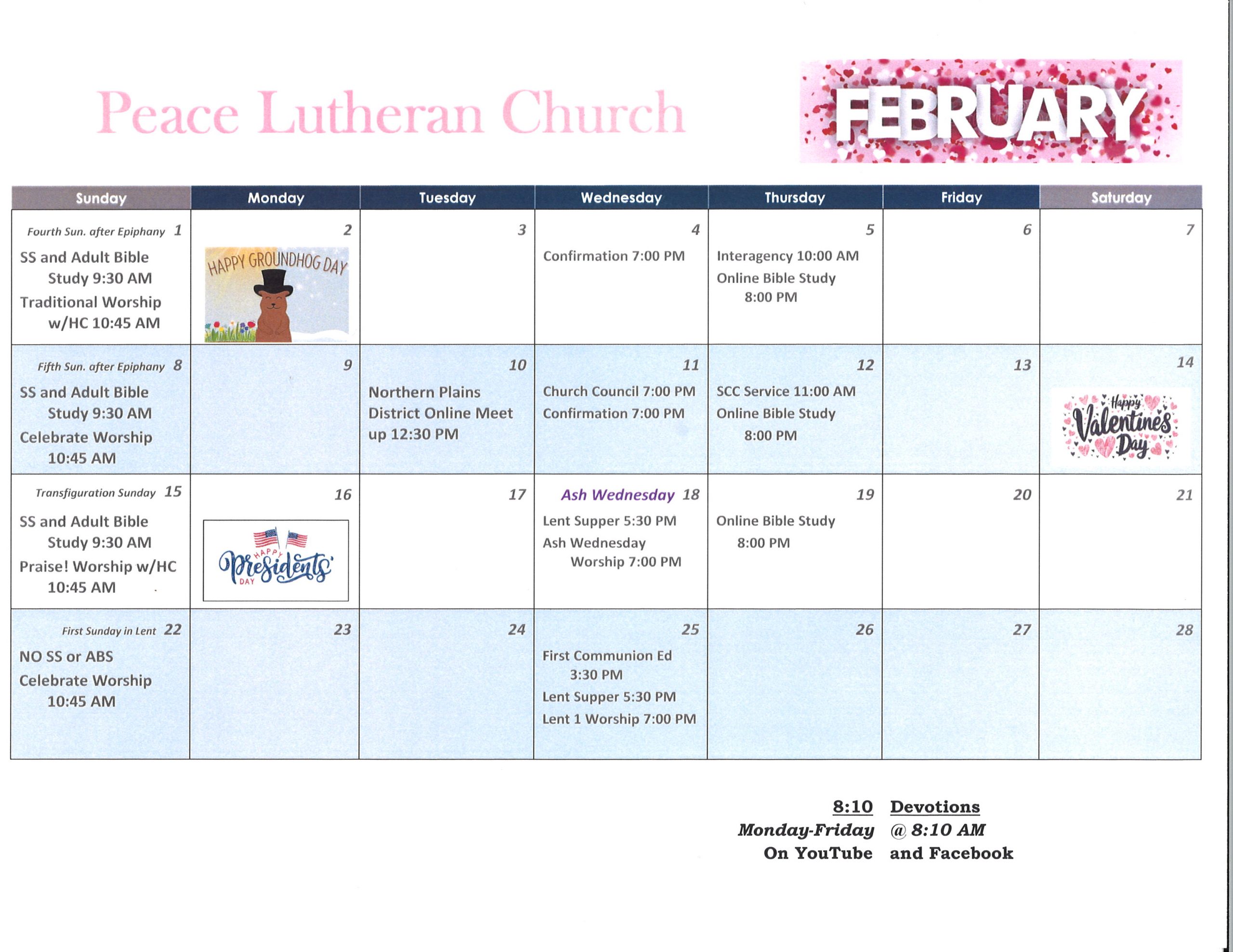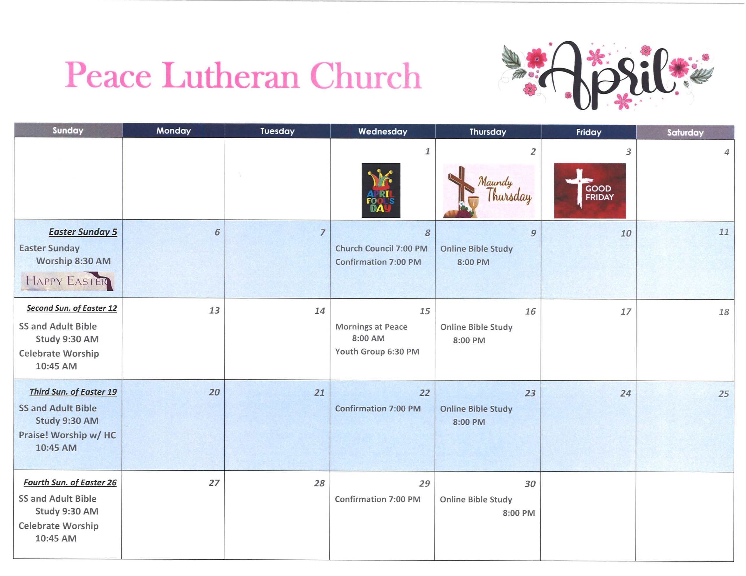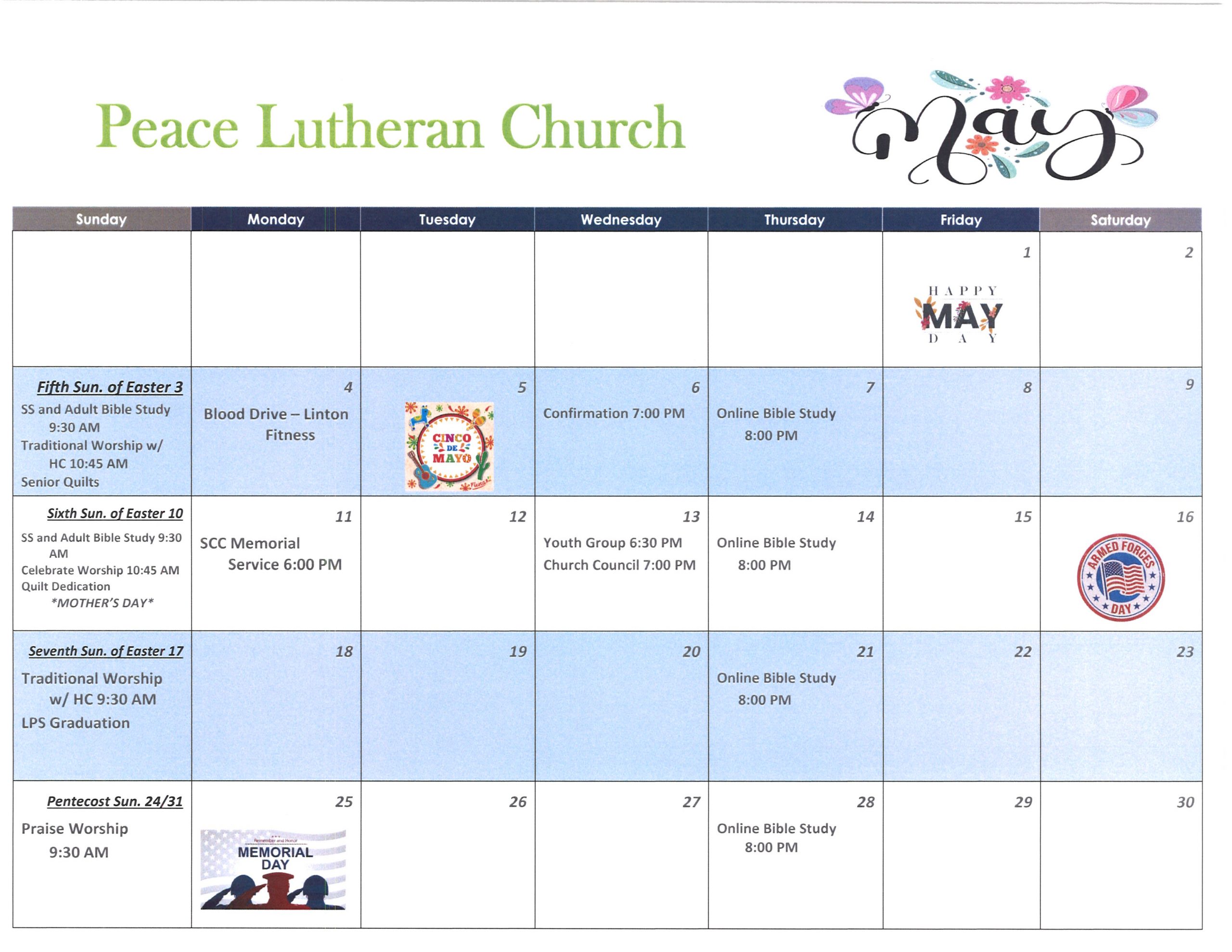 Worship is held each Sunday at 10:45 AM with Sunday School (pre-K to 7th grade) and Adult Bible Study taking place at 9:30 AM. Holy Communion is served on the 1st and 3rd Sundays of the month. Online Bible Study, 8:10 Devotions, and Sunday Worship are available online (see below.)